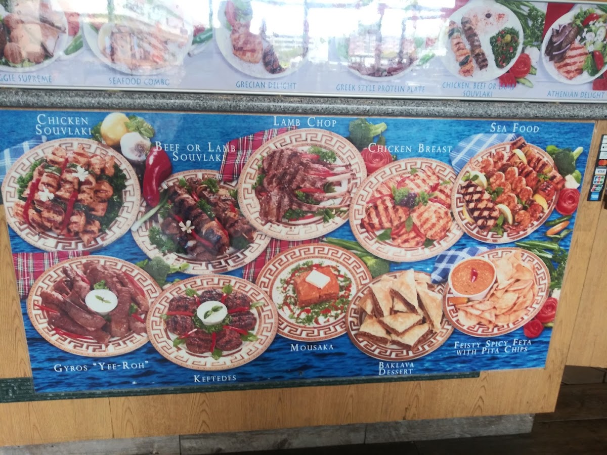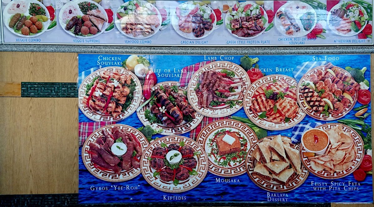 The menu at Greek Islands Cuisine offers a delightful variety of Mediterranean dishes, showcasing both traditional and contemporary Greek flavors. For seafood enthusiasts, the Fish Souvlaki "Shish Kebab", Halibut Fillet, and Shrimp Souvlaki "Shish Kebab" are standout options, alongside a satisfying Seafood Combo. Their Greek Islands Specials include favorites like the Athenian Delight, Grecian Delight, and the Greek Style Protein Plate, perfect for those looking to enjoy a blend of authentic flavors. The restaurant's plates feature classics such as Gyro "Yearoh", Chicken "Cotopolo", and Souvlaki "Shish-Kebab", with sides like Dolmades, Falafel, and French Fries rounding out the menu. Sandwich lovers can enjoy a range of options, including the Gyro Sandwich, Chicken Sandwich, and Souvlaki "Shish-Kebab" Sandwich. There are also hearty salads, such as the Greek Salad, Chicken Salad, and the mixed Chicken & Gyro Salad, all bursting with fresh ingredients. For a lighter bite, the Veggie Combo or Spanakopita "Spinach Pie" from the Veggie Side will surely satisfy. No meal at Greek Islands is complete without the sweet touch of their famous Baklava. Additionally, the restaurant offers convenient party trays, such as the Souvlaki "Shish Kebab Party and the Vegetarian Party Tray, perfect for larger gatherings. To wash it all down, guests can choose from a selection of Soft Drinks or Bottled Water.